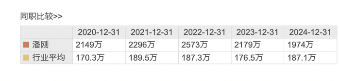 东方财富数据显示,2020年至2024年,潘刚薪酬分别为2149万元、2296万万元、2573万元、2179万元、1974万元。