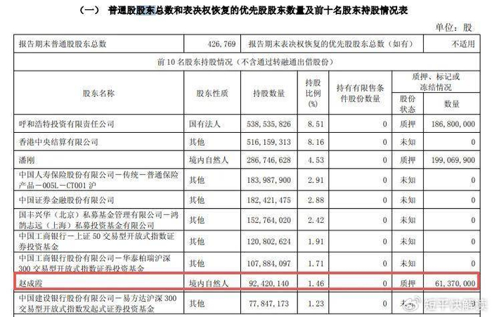 截至公告披露日,潘刚持有公司286,746,628股,占公司总股本的4.53%,另据2025年三季报,其持有的199,069,900股处于质押中,占其持股比例的69.42%,接近七成股份处于质押中。