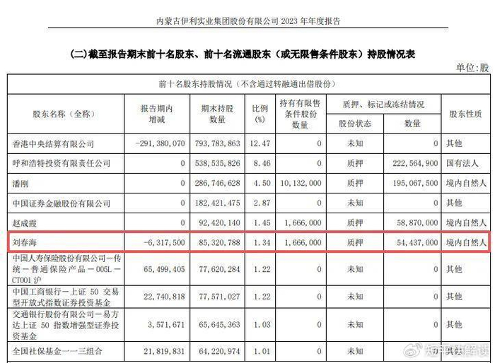 原副总裁退休后减持。2023年4月,伊利股份原副总裁刘春海因到龄原因退休,随后在当年通过二级市场减持公司股份631.75万股,持股、比例分别降低至8532.08万股、1.34%,但仍然位列前十股东,2024年末则消失在前十股东之列,期末第十大股东持股数量为8032.87万股,这意味着刘春海在当年继续实施减持,不过因为其并非大股东、高管,所以减持不用进行披露。