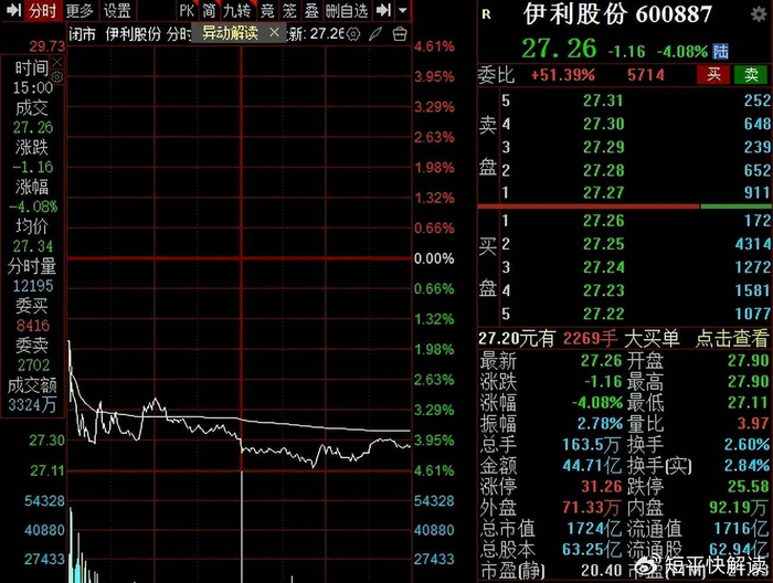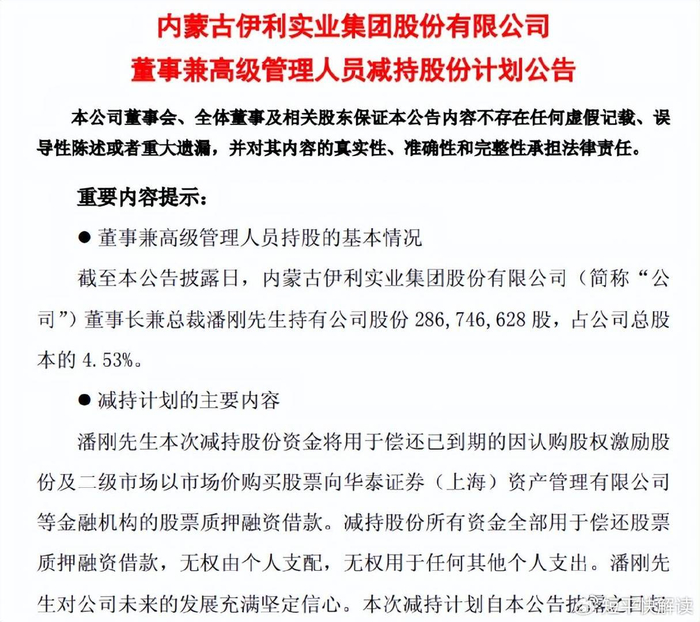 董事长潘刚拟减持,伊利股份股价大跌