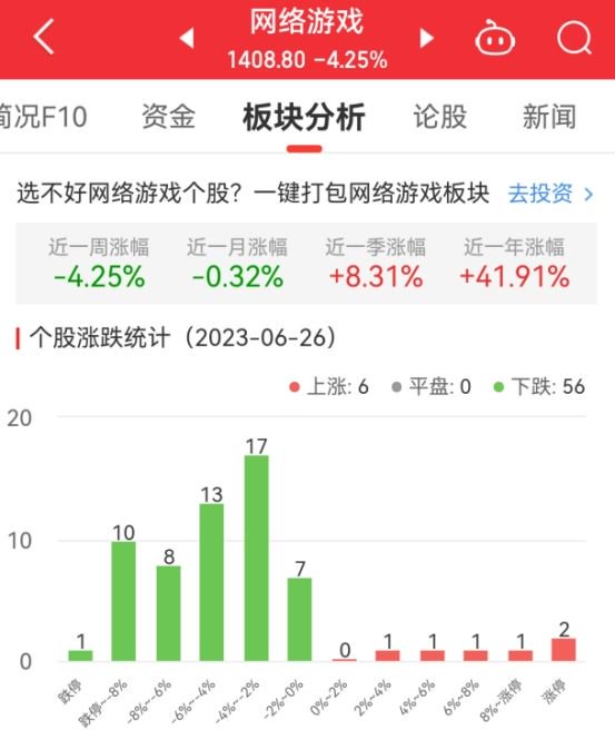 中国经济网北京6月26日讯今日,网络游戏板块整体跌幅4.25%,其中6只股票上涨,0只股票平盘,56只股票下跌。