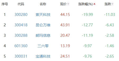 紫天科技、昆仑万维、朗玛信息、三六零、宝通科技位列涨幅榜后五位,涨幅分别为-19.99%、-12.77%、-11.19%、-9.97%、-9.76%。