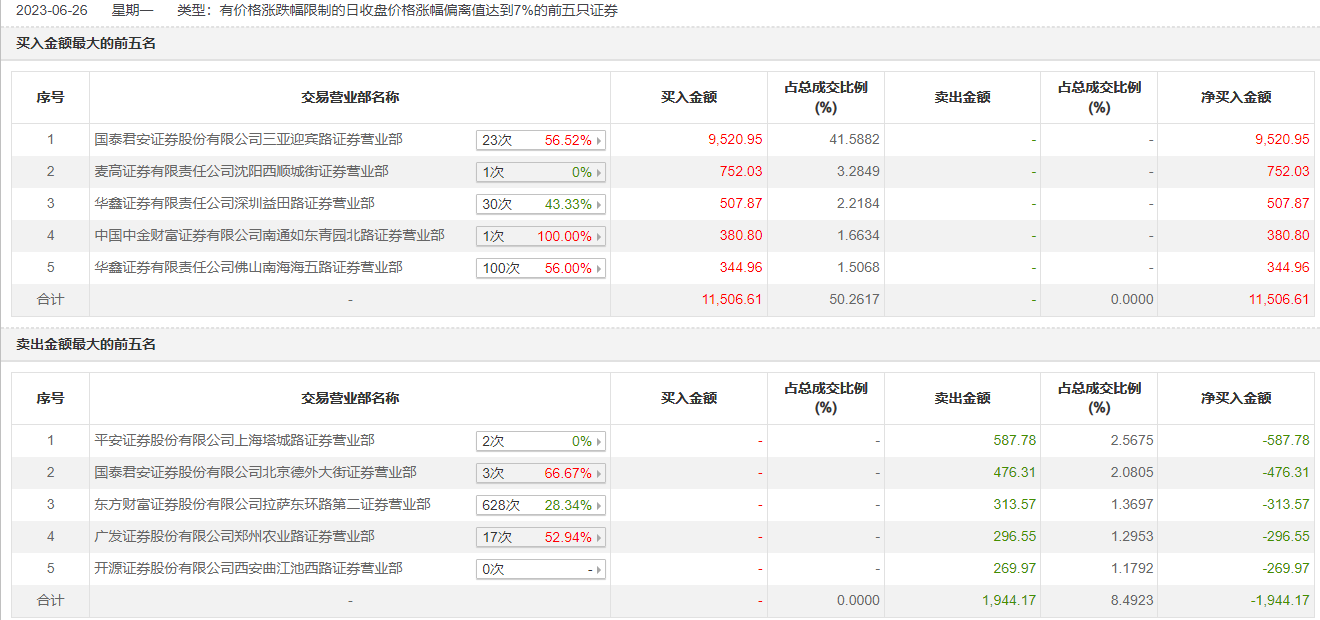 具体来看,国泰君安证券三亚迎宾路证券营业部、麦高证券沈阳西顺城街证券营业部分别买入9520.95万元、752.03万元;平安证券上海塔城路证券营业部、国泰君安证券北京德外大街证券营业部分别卖出587.78万元、476.31万元。