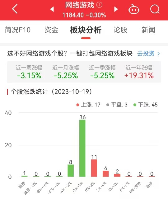 中国经济网北京10月19日讯今日,网络游戏板块整体跌幅0.30%,其中17只股票上涨,3只股票平盘,45只股票下跌。