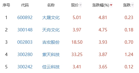 其中,大晟文化、天舟文化、吉宏股份、紫天科技(维权)、佳云科技位列板块涨幅前五位,涨幅分别为4.81%、4.75%、3.93%、3.87%、3.65%。
