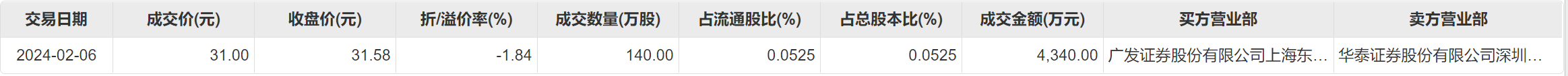 今日大宗交易成交140万股,成交额4340万元,占当日总成交额的7.74%,成交价31元,较市场收盘价折价1.84%。
