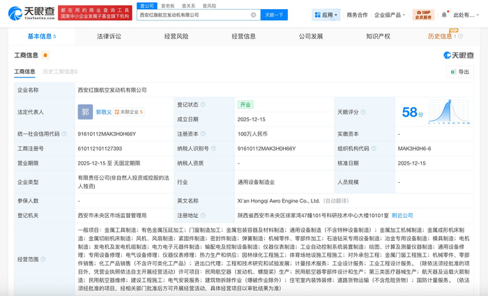 雷达财经讯,天眼查App显示,近日,西安红旗航空发动机有限公司成立,法定代表人为郭敬义,注册资本100万人民币,经营范围含金属工具制造、有色金属压延加工、门窗制造加工、金属包装容器及材料制造、通用设备制造、金属加工机械制造、冶金专用设备制造、仪器仪表修理、热力生产和供应等,由航发动力(600893)全资持股。