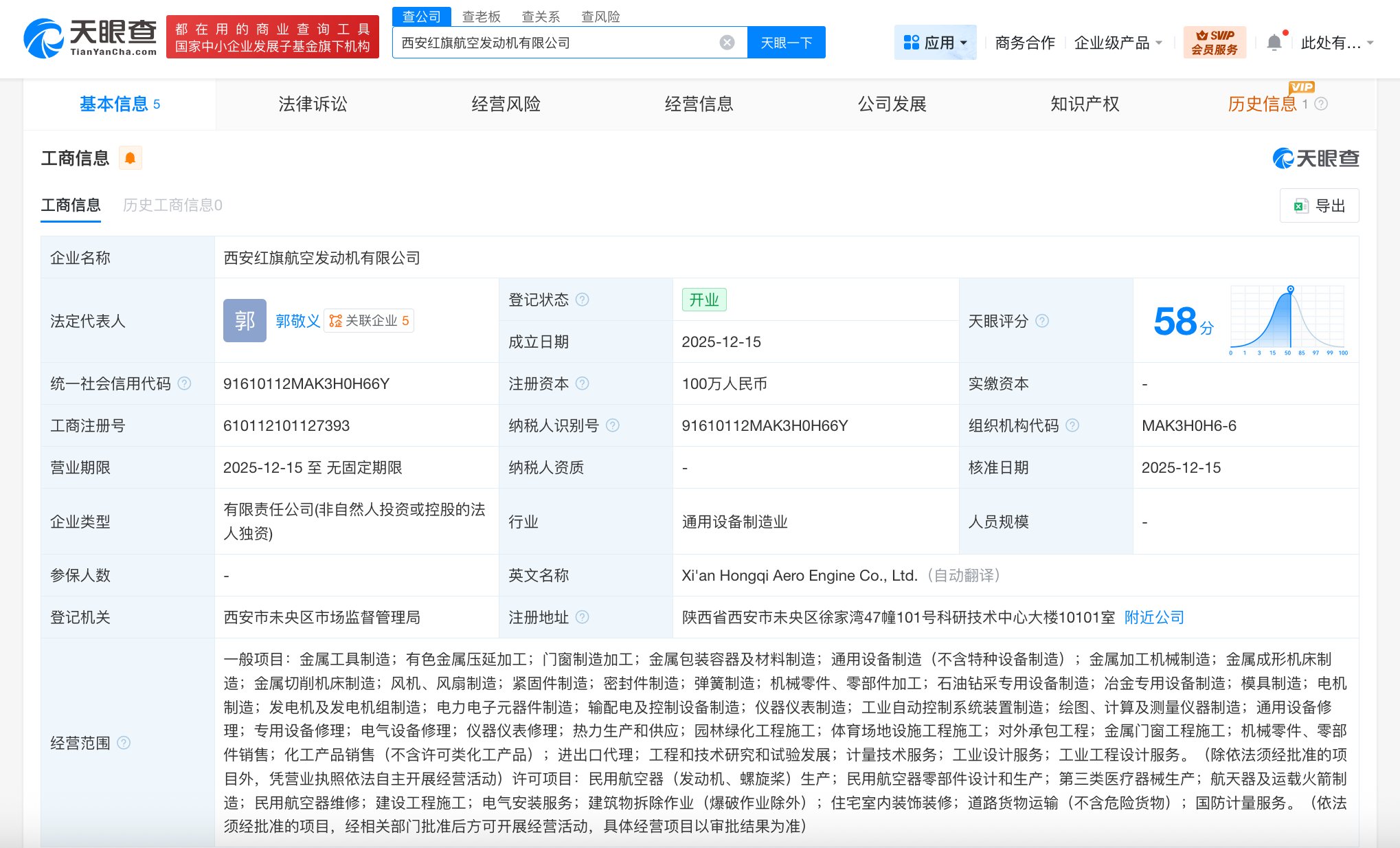 每经AI快讯,天眼查App显示,近日,西安红旗航空发动机有限公司成立,法定代表人为郭敬义,注册资本100万元人民币,经营范围含金属工具制造、有色金属压延加工、门窗制造加工、金属包装容器及材料制造、通用设备制造、金属加工机械制造、冶金专用设备制造、仪器仪表修理、热力生产和供应等,由航发动力(600893)全资持股。