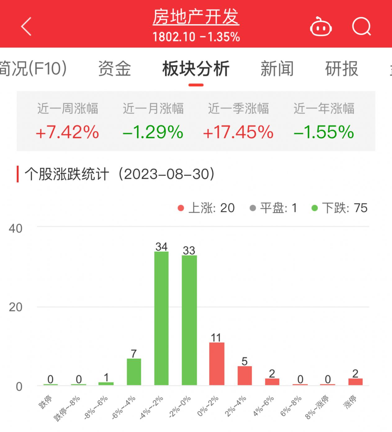 中国经济网北京8月30日讯 今日,房地产开发板块整体跌幅1.35%,其中20只股票上涨,1只股票平盘,75只股票下跌。