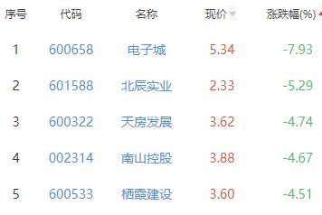 电子城、北辰实业、天房发展、南山控股、栖霞建设位列涨幅榜后五位,涨幅分别为-7.93%、-5.29%、-4.74%、-4.67%、-4.51%。