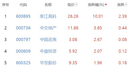其中,张江高科、中交地产、中国武夷、中迪投资、华发股份位列板块涨幅榜前五位,涨幅分别为10.01%、3.85%、2.67%、2.07%、1.96%。