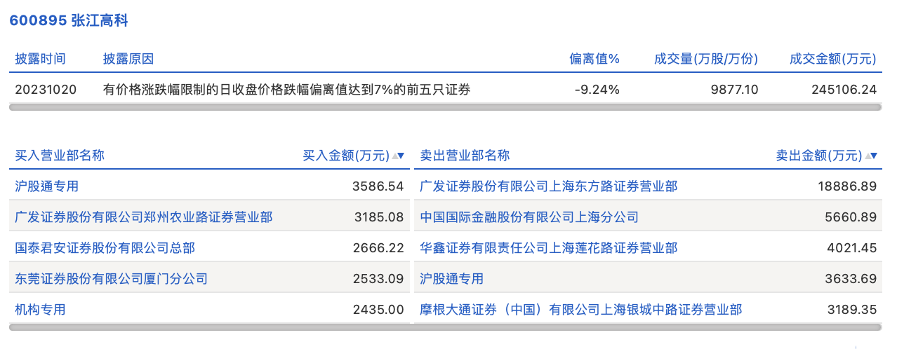 10月20日,张江高科今日跌停,全天换手率达6.38%,振幅达6.36%。龙虎榜数据显示,营业部席位合计净卖出2.1亿元。其中,机构合计净买入2435.0万元。此外,广发证券上海东方路证券营业部、中国国际金融上海分公司分别卖出1.89亿元、5660.89万元;沪股通专用、广发证券郑州农业路证券营业部分别买入3586.54万元、3185.08万元。