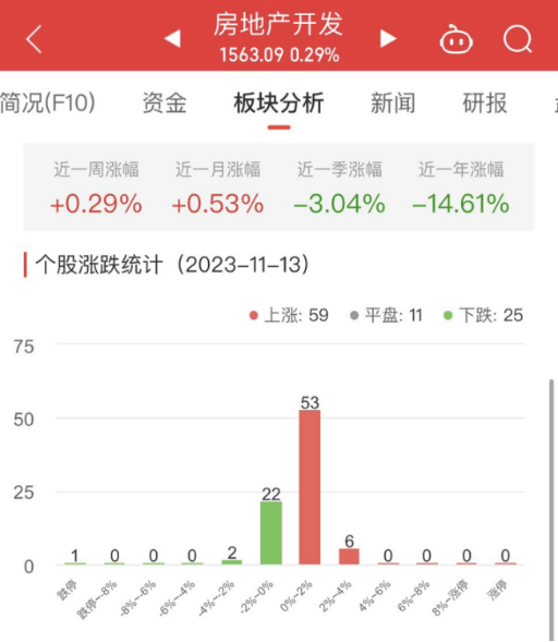 中国经济网北京11月13日讯今日,房地产开发板块整体涨幅0.29%,其中59只股票上涨,11只股票平盘,25只股票下跌。