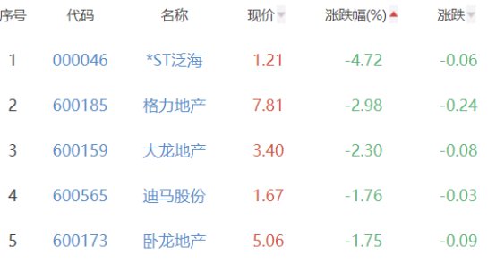 *ST泛海、格力地产、大龙地产、迪马股份、卧龙地产位列板块涨幅榜后五位,涨幅分别为-4.72%、-2.98%、-2.30%、-1.76%、-1.75%。