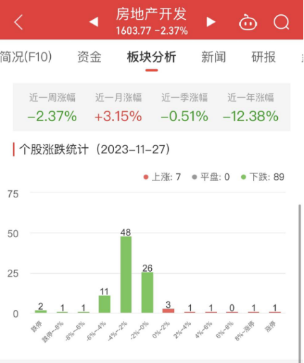 中国经济网北京11月27日讯今日,房地产开发板块整体涨幅-2.37%,其中7只股票上涨,89只股票下跌。