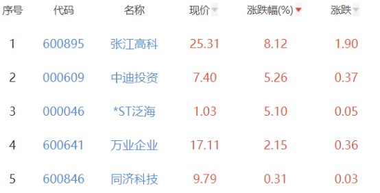 其中,张江高科、中迪投资、*ST泛海、万业企业、同济科技位列板块涨幅榜前五位,涨幅分别为8.12%、5.26%、5.10%、2.15%、0.31%。
