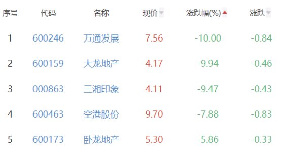 万通发展、大龙地产、三湘印象、空港股份(维权)、卧龙地产位列板块涨幅榜后五位,涨幅分别为-10.00%、-9.94%、-9.47%、-7.88%、-5.86%。