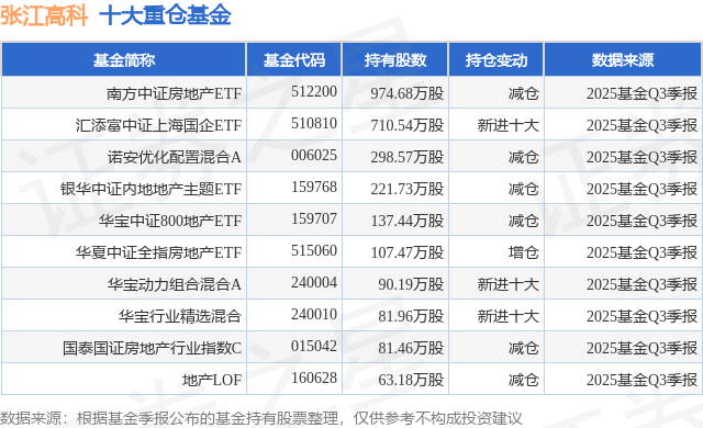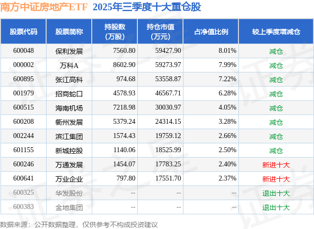 根据2025基金Q3季报公募基金重仓股数据,重仓该股的公募基金共20家,其中持有数量最多的公募基金为南方基金的南方中证房地产ETF。南方中证房地产ETF目前规模为74.18亿元,最新净值1.4791(12月30日),较上一交易日下跌1.14%,近一年下跌0.56%。该公募基金现任基金经理为罗文杰。罗文杰在任的基金产品包括:南方中证500ETF联接(LOF)A,管理时间为2013年4月22日至今,期间收益率为148.43%;南方中证500ETF,管理时间为2013年4月22日至今,期间收益率为156.6%;南方沪深300ETF,管理时间为2013年5月17日至今,期间收益率为152.81%;南方沪深300ETF联接A,管理时间为2013年5月17日至今,期间收益率为138.27%。