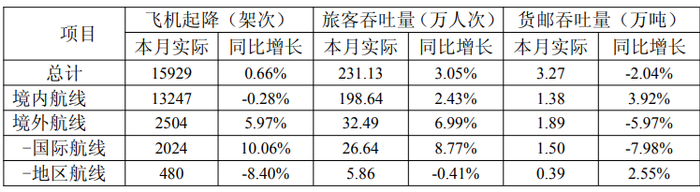 10月13日,厦门空港(600897)发布公告,2025年9月运输生产情况简报显示,飞机起降架次为15929,同比增长0.66%;旅客吞吐量为231.13万人次,同比增长3.05%;货邮吞吐量为3.27万吨,同比下降2.04%。具体数据如下: