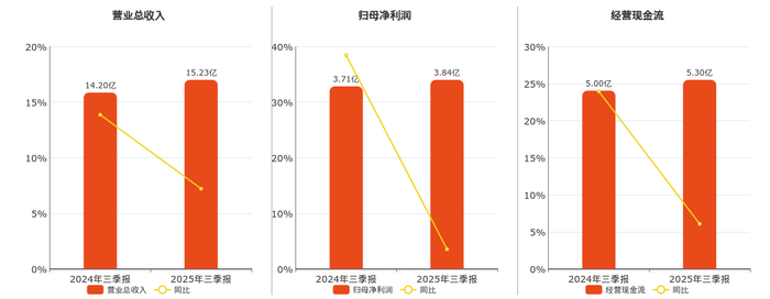 公司营业总收入为15.23亿元,较去年同报告期营业总收入增加1.02亿元,实现3年连续上涨,同比较去年同期上涨7.21%。归母净利润为3.84亿元,较去年同报告期归母净利润增加1310.00万元,实现3年连续上涨,同比较去年同期上涨3.53%。经营活动现金净流入为5.30亿元,较去年同报告期经营活动现金净流入增加3031.99万元,实现3年连续上涨,同比较去年同期上涨6.07%。