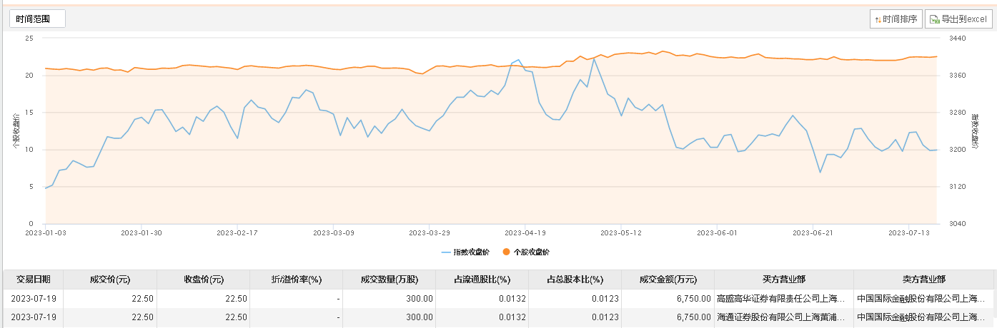 7月19日大宗交易成交600万股,成交额1.35亿元,占当日总成交额的15.37%,成交价22.5元,较市场收盘价22.5元持平。