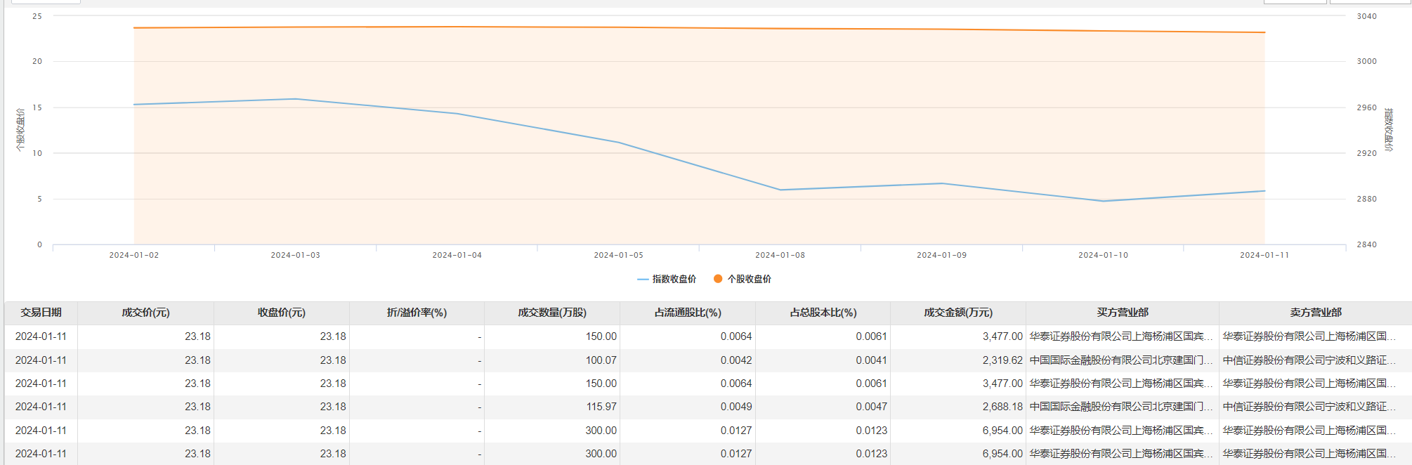 1月11日大宗交易成交1116.04万股,成交额2.59亿元,占当日总成交额的15.46%,成交价23.18元,较市场收盘价持平。