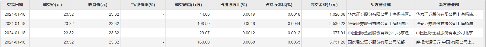 今日大宗交易成交341.57万股,成交额7965.41万元,占当日总成交额的2.73%,成交价23.32元,较市场收盘价持平。