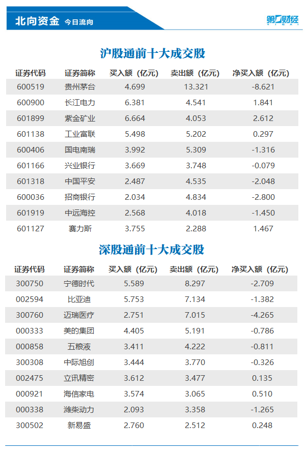 净卖出额居前三的是贵州茅台、迈瑞医疗、招商银行,分别遭净卖出8.62亿元、4.27亿元、2.80亿元。