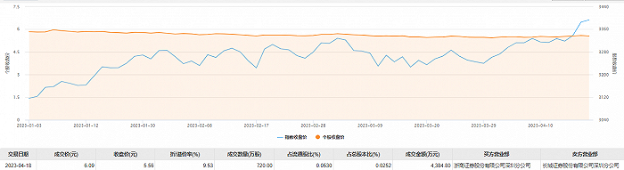 4月18日大宗交易成交720万股,成交额4384.8万元,占当日总成交额的9.82%,成交价6.09元,较市场收盘价5.56元溢价9.53%。