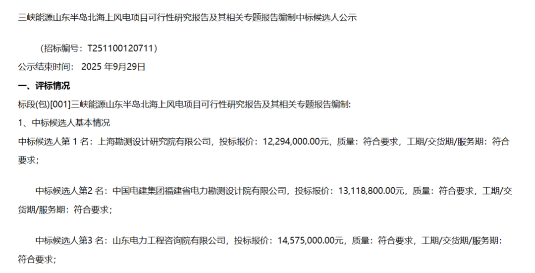 9月29日,中国三峡电子采购平台发布《三峡能源山东半岛北海上风电项目可行性研究报告及其相关专题报告编制中标候选人公示》公告。