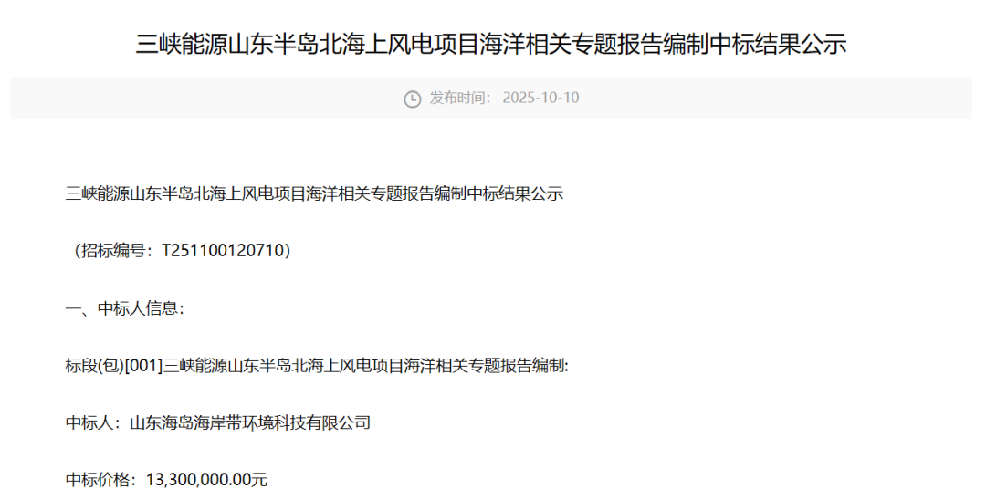 10月10日,中国三峡电子采购平台发布《三峡能源山东半岛北海上风电项目海洋相关专题报告编制中标结果公示》的公告。