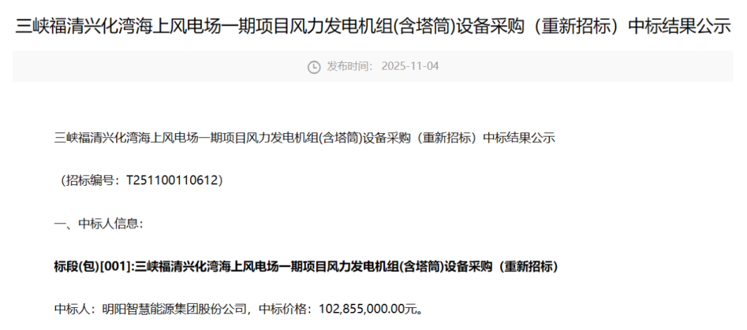 11月4日,中国三峡电子采购平台发布《三峡福清兴化湾海上风电场一期项目风力发电机组(含塔筒)设备采购(重新招标)中标结果公示》的公告。