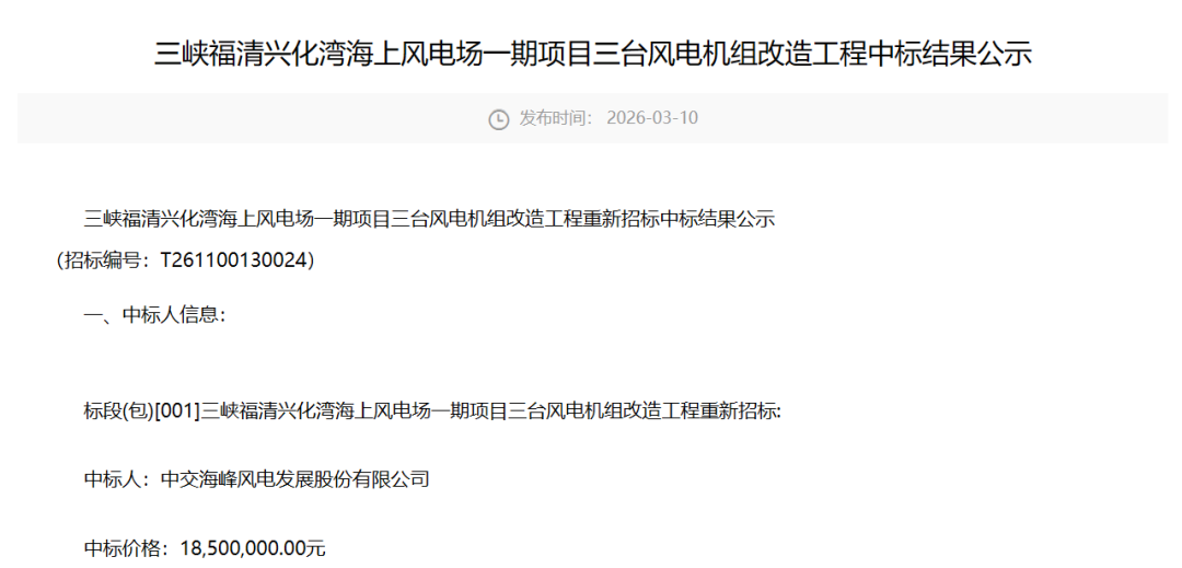 3月10日,中国三峡电子采购平台发布《三峡福清兴化湾海上风电场一期项目三台风电机组改造工程中标结果公示》。