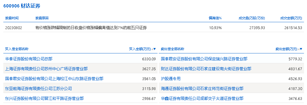 具体来看,华泰证券总部、上海证券苏州中心广场证券营业部分别买入6330.09万元、3627.35万元;国泰君安证券保定瑞兴路证券营业部、财达证券石家庄建设南大街证券营业部分别卖出5779.32万元、4831.67万元。