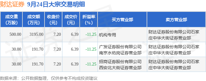9月24日财达证券现3笔折价11.25%的大宗交易 合计成交3578.4万元
