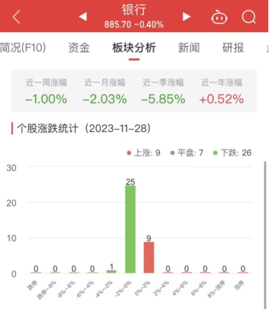 中国经济网北京11月28日讯今日,银行板块整体跌幅0.40%,其中9只股票上涨,7只股票平盘,26只股票下跌。
