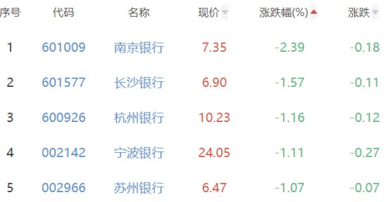 南京银行、长沙银行、杭州银行、宁波银行和苏州银行位列涨幅榜后五位,涨幅分别为-2.39%、-1.57%、-1.16%、-1.11%和-1.07%。