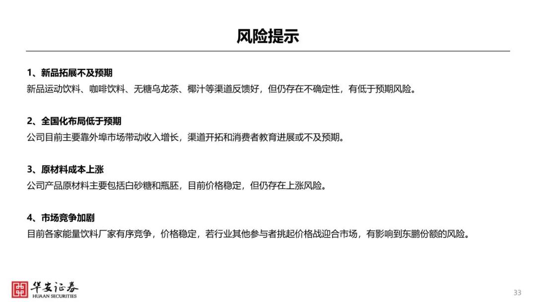 新品拓展不及预期;全国化布局不及预期;原材料成本上涨;市场竞争加剧。
