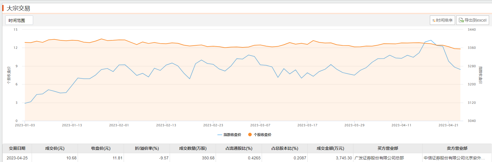 4月25日大宗交易成交350.68万股,成交额3745.3万元,占当日总成交额的12.81%,成交价10.68元,较市场收盘价11.81元折价9.57%。