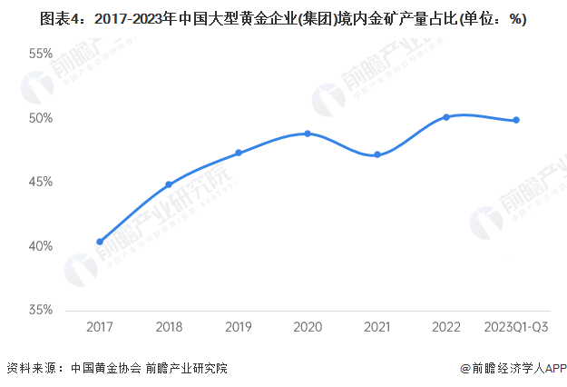 2023年前三季度,国内大型黄金企业(集团)境内矿山矿产金产量107.058吨,占全国的比重为49.83%。