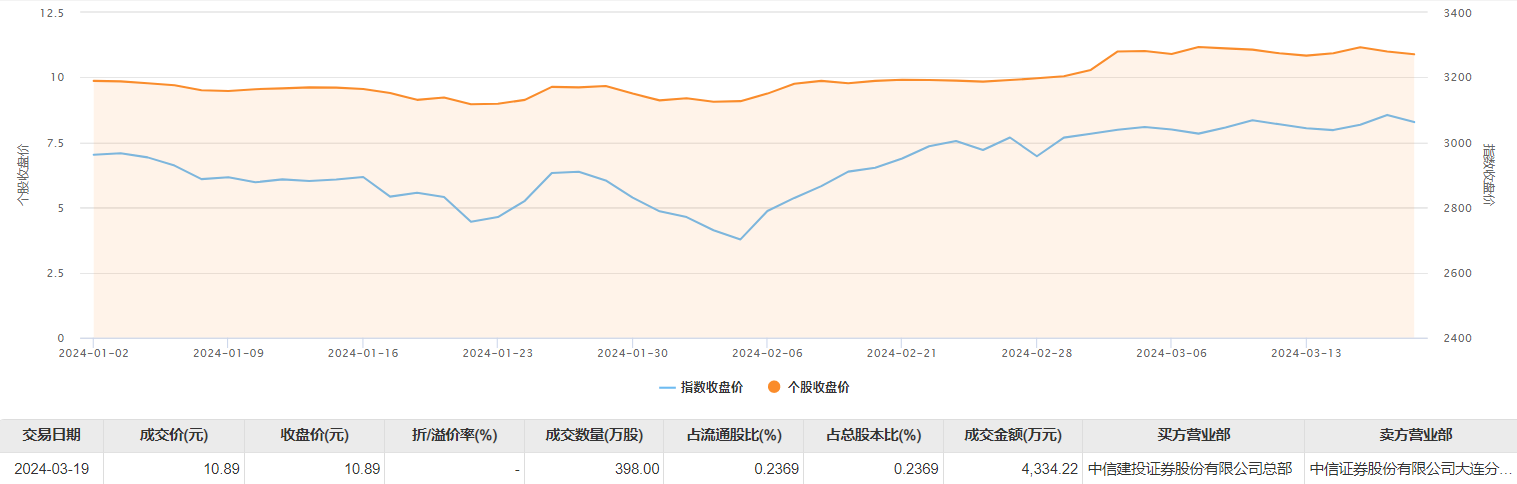 3月19日大宗交易成交398万股,成交额4334.22万元,占当日总成交额的21.86%,成交价10.89元,较市场收盘价10.89元持平。