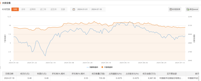 今日大宗交易成交735万股,成交额6967.8万元,占当日总成交额的31.17%,成交价9.48元,较市场收盘价持平。