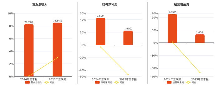 公司营业总收入为73.84亿元,较去年同报告期营业总收入增加2.13亿元,实现5年连续上涨,同比较去年同期上涨2.97%。归母净利润为1.40亿元,较去年同报告期归母净利润减少1.25亿元,同比较去年同期下降47.14%。经营活动现金净流入为1.60亿元,较去年同报告期经营活动现金净流入减少3.86亿元,同比较去年同期下降70.73%。