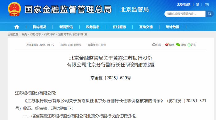 批复显示,核准黄霞江苏银行股份有限公司北京分行副行长的任职资格。