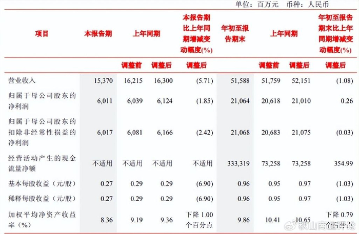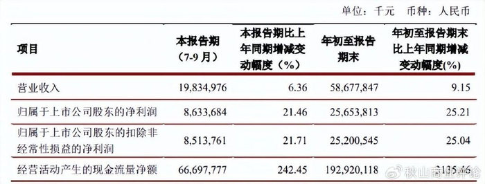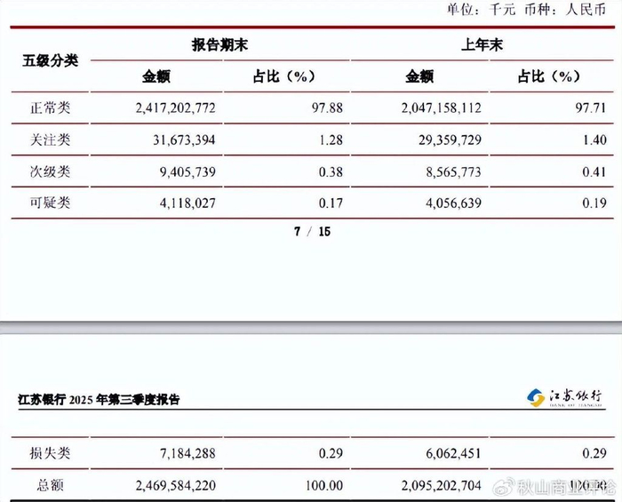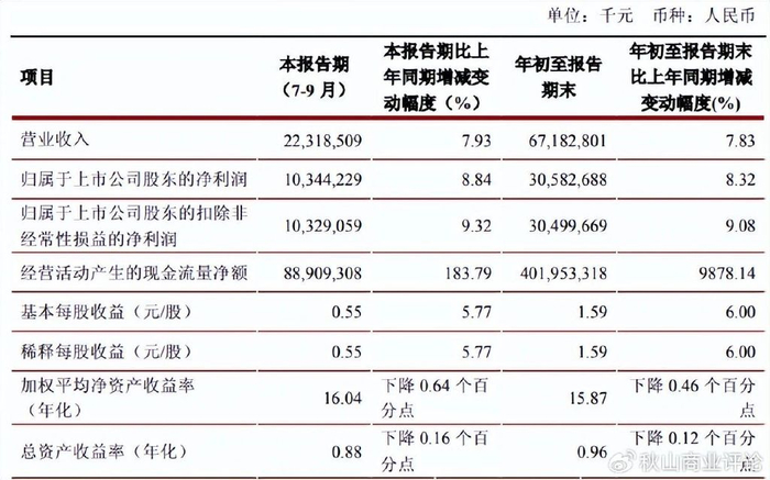 三季报显示,江苏银行今年第三季度的营收为223.19亿元,同比增加7.93%;归属于上市公司股东的净利润为103.44亿元,同比增加8.84%。前三个季度,江苏银行实现营收671.83亿元,同比增加7.83%;实现净利润305.83亿元,同比增加8.32%。截至今年9月30日,江苏银行的总资产达到了4.93万亿元,相比去年末的3.95万亿元,增幅为24.68%。