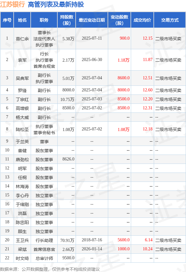 江苏银行近半年内的董监高及核心技术人员增减持详情如下: