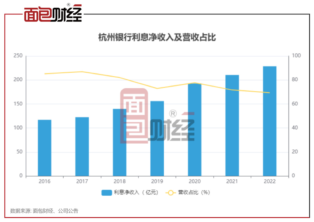 历史数据显示,杭州银行自2016年上市以来,利息净收入保持增长,但该行利息净收入的营收占比整体呈下降趋势,从2016年的85.17%下降至2022年的69.41%。