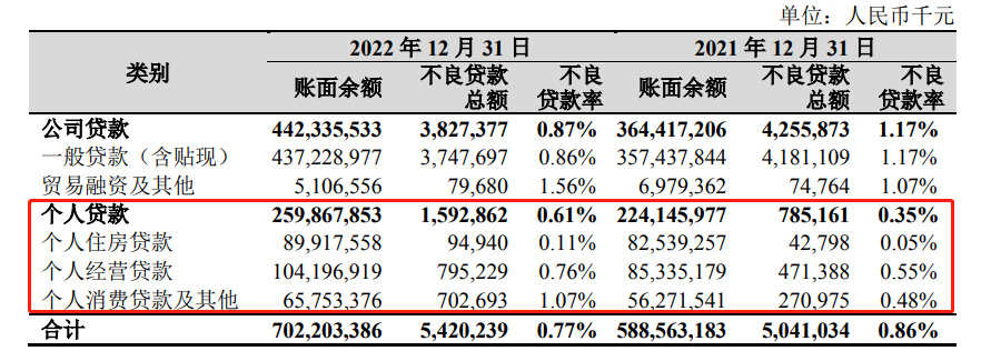 根据财报数据,2023年一季度末,该行不良贷款余额增加,总体不良贷款率有所下降。但需注意,2022年末,该行个人贷款不良贷款率较2021年末增加0.26个百分点。