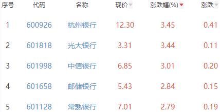 其中,杭州银行、光大银行、中信银行、邮储银行和常熟银行位列板块涨幅前五位,涨幅分别为3.45%、3.44%、3.01%、2.84%和2.79%。
