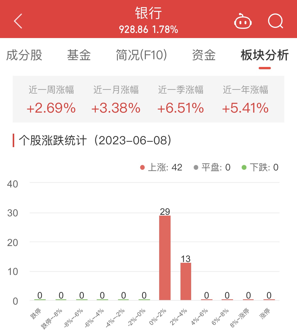 中国经济网北京6月8日讯今日,银行板块整体涨幅1.78%,其中42只股票全部上涨。